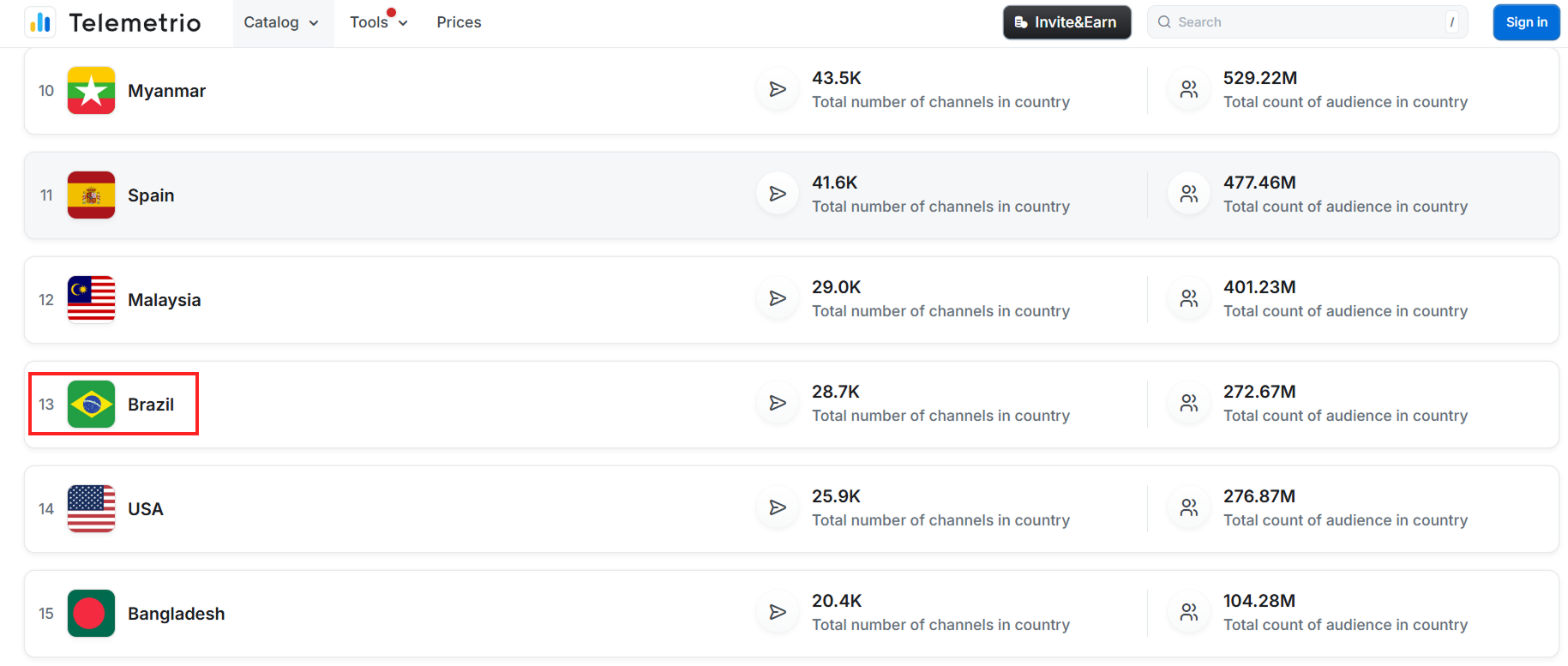 All available GEOs will be displayed on the screen, sorted in alphabetical order. Let's look at how the system works using a search example in Brazil — selecting the country shows all available Telegram channels in that region.
