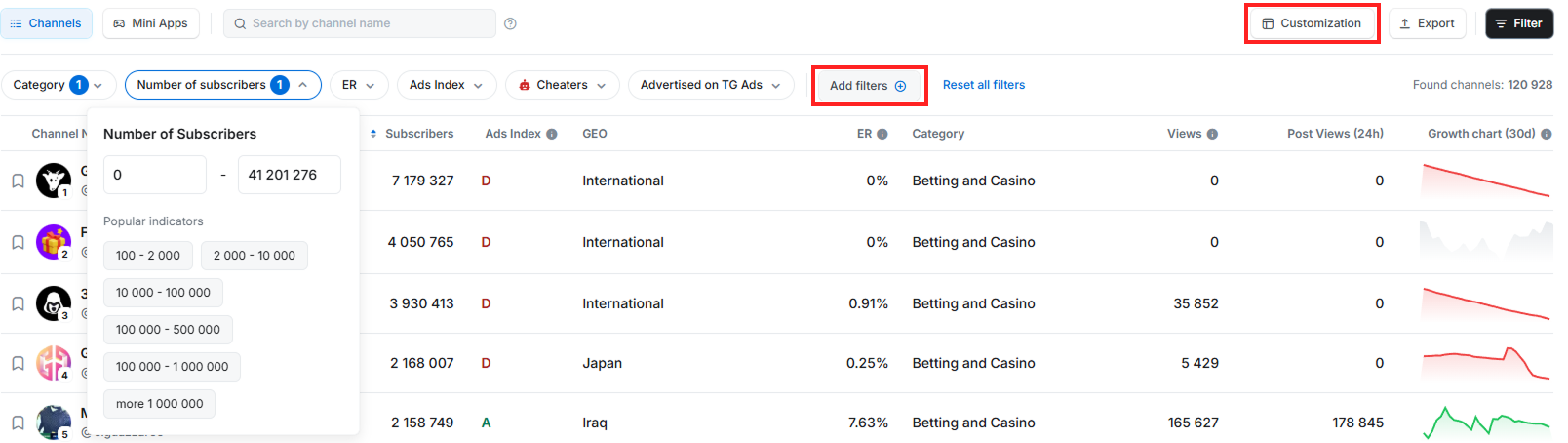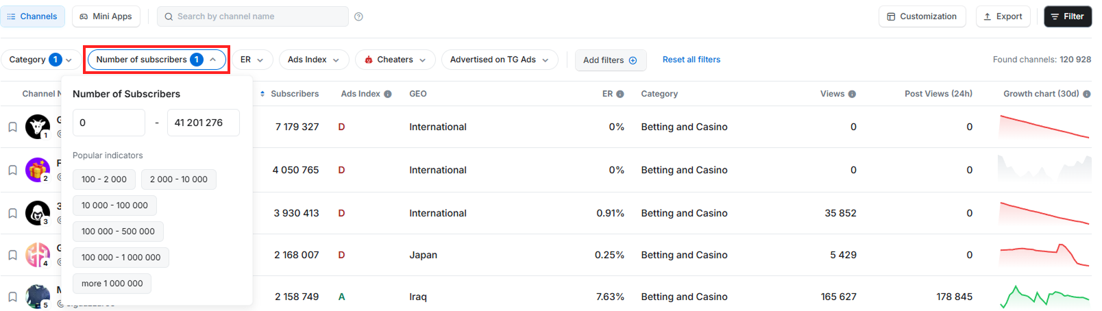 For example, you might want to first thoroughly analyze channels with an audience of 2,000 to 5,000 people, then move to the next range — from 5,001 to 10,000. This way, you can clearly track which segments have already been analyzed and which still need to be reviewed.