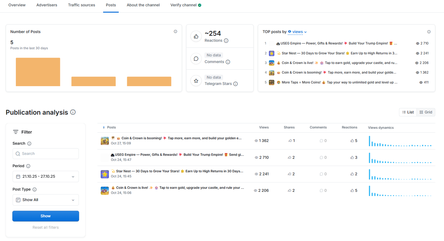 The "Posts" section provides detailed information about the content and its effectiveness. Here you can examine every post, evaluate its metrics, and determine which formats generate the most response from the audience. This aids in planning a launch strategy and allows you to rely on the actual preferences of a target audience.