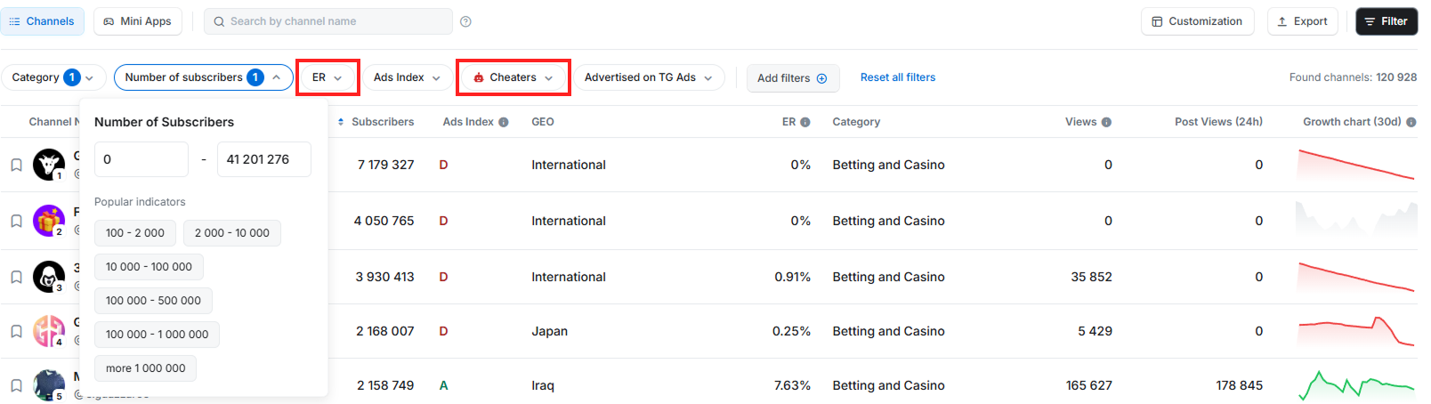 "ER": allows precisely setting the required level of subscriber activity or specifying a minimum activity threshold. This helps to filter out channels with low engagement;