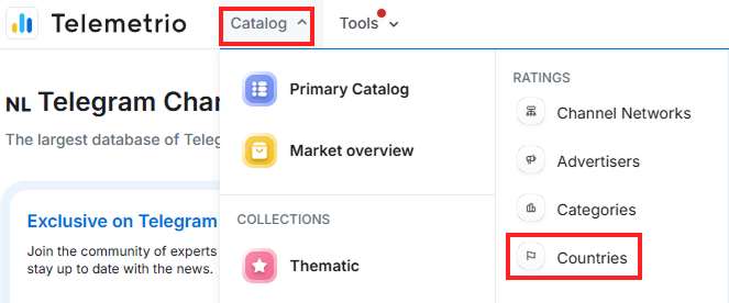 To use this filter, simply navigate to the "Catalog" section in the site's top menu and then select the "Countries" category.