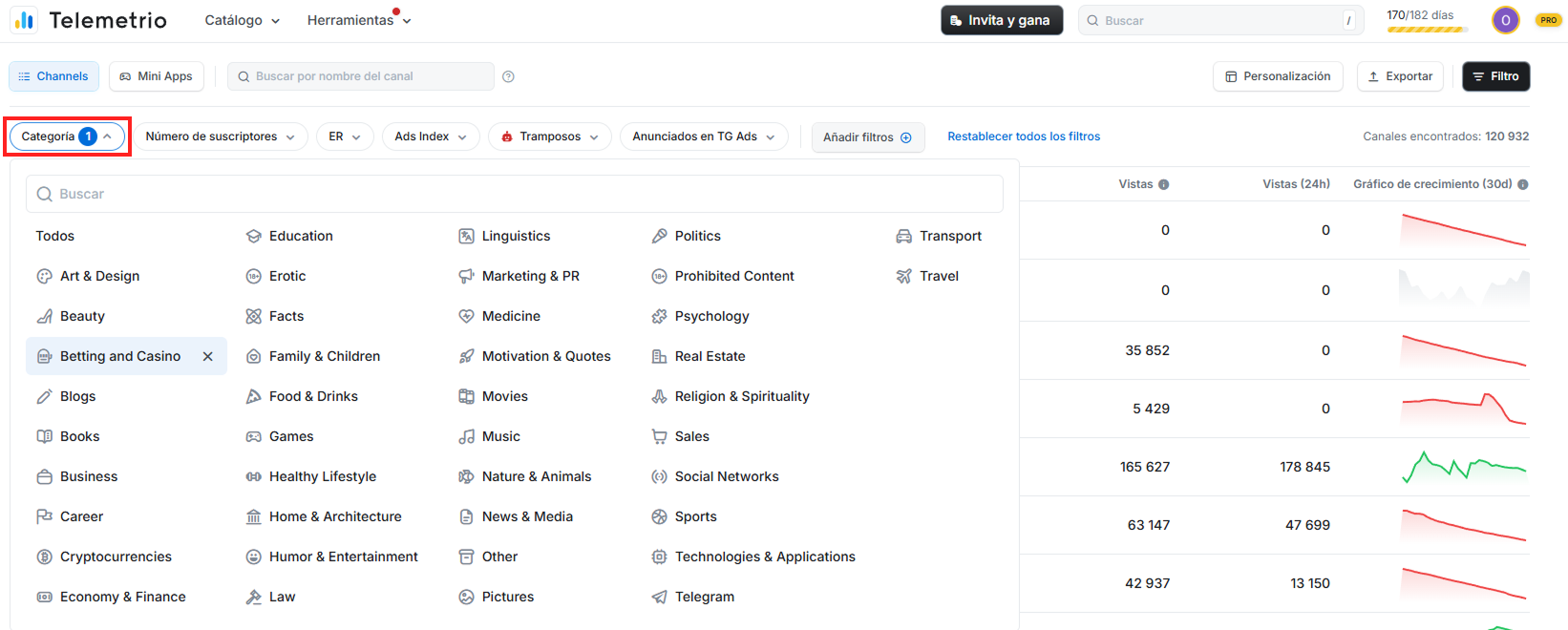 Activating the filter displays an additional parameter bar. One of the most useful is "Category". It allows you to set the thematic focus. Clicking the filter opens a list of available categories, including "Betting and Casino".