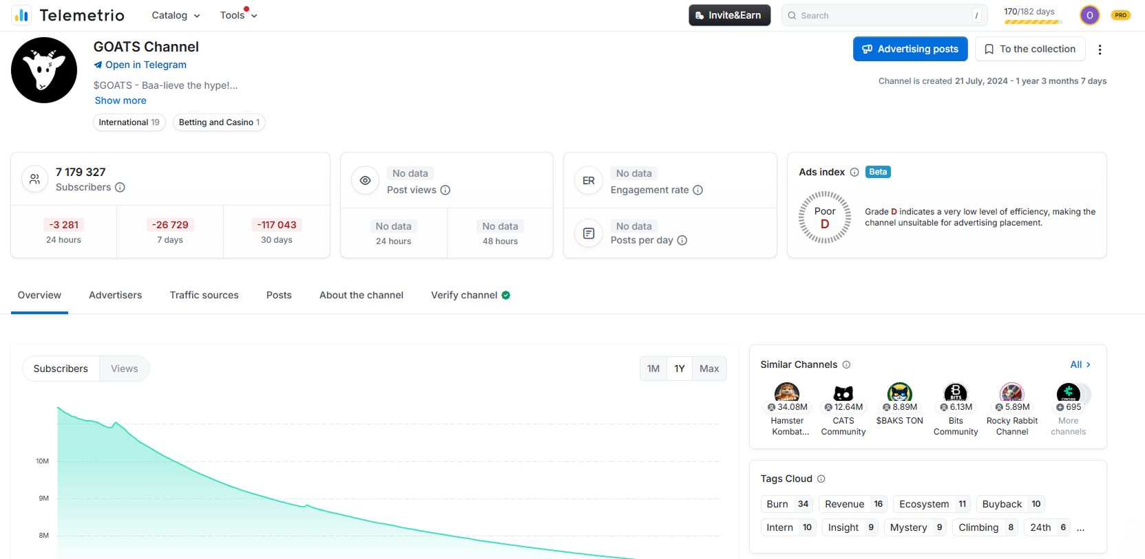 Telemetr.io allows you to obtain detailed statistics, evaluate channel quality, find similar sources, and select keywords for manual searching.